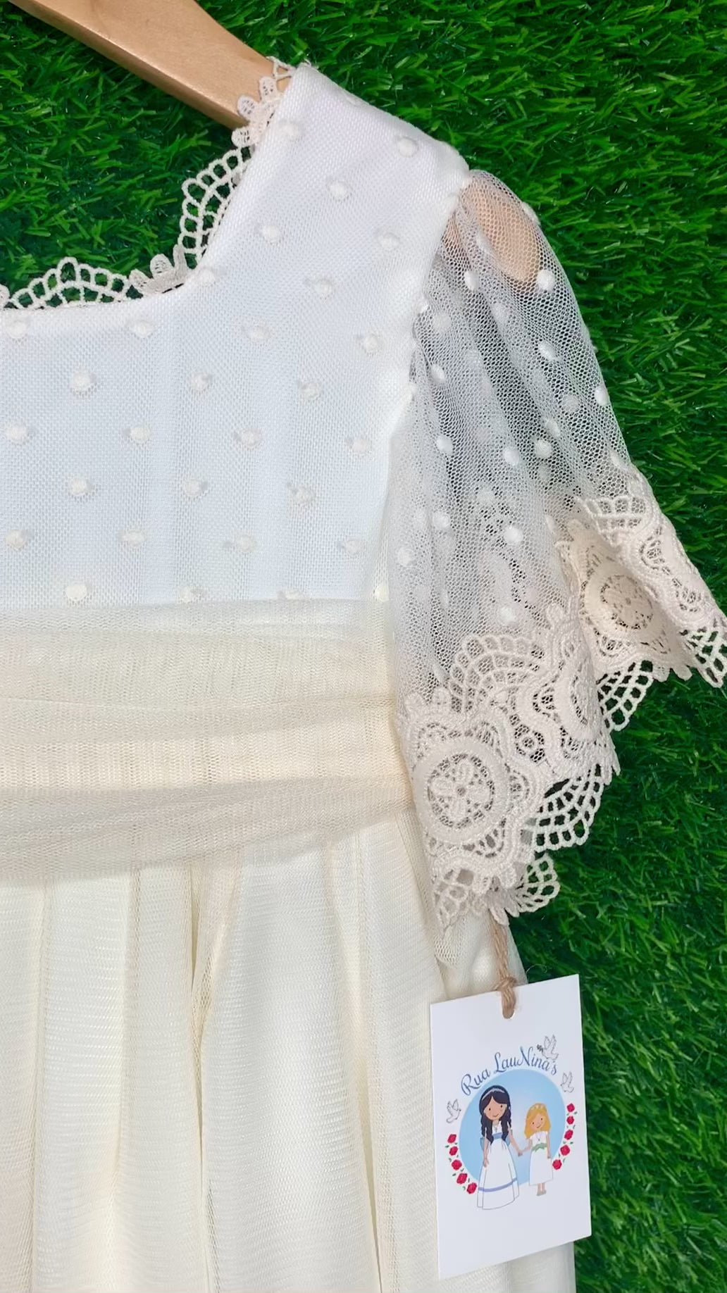 This charming ivory-toned dress is perfect for special occasions. The bodice is adorned with small embroidered dots over soft tulle, adding a delicate texture. The semi-transparent tulle sleeves are decorated with beige lace, giving a vintage touch.