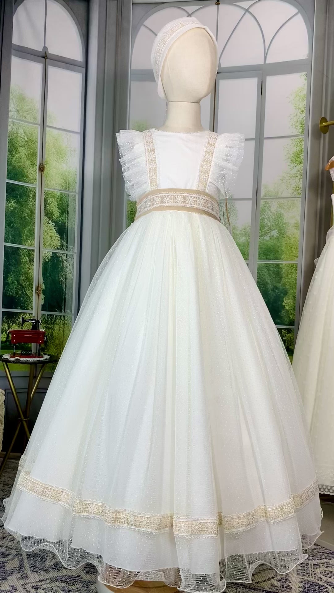 This dress is ideal for a First Communion or any type of ceremony, thanks to its elegant and traditional design. Made in a soft ivory tone, the dress features delicate embroidered tulle with dots and beige lace ribbons that adorn the straps and waist, adding a romantic and refined touch.