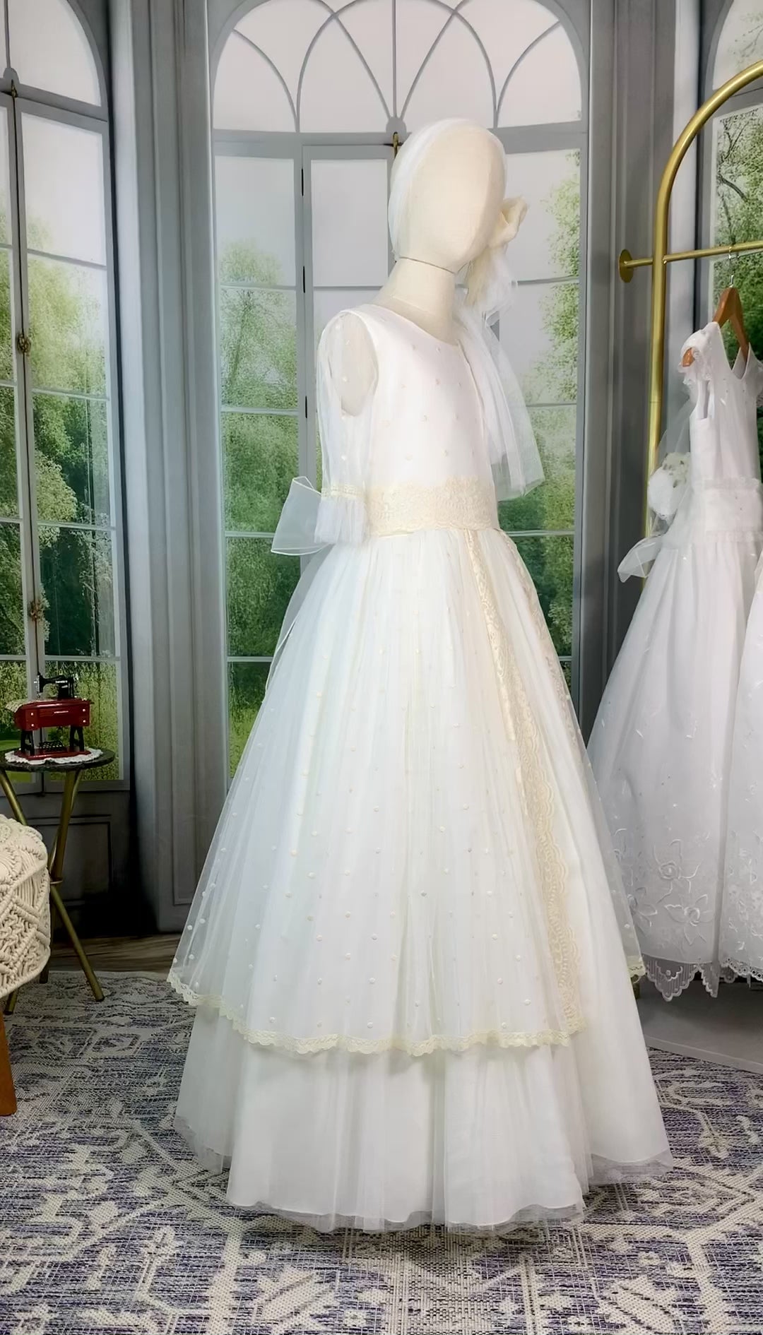 This First Communion dress in soft ivory tones stands out for its elegance and delicacy. The bodice is decorated with delicate tulle embroidered with small dots, adding a refined touch. The three-quarter length tulle sleeves are adorned with lace at the cuffs and ruffles, giving the dress a romantic and ethereal style.