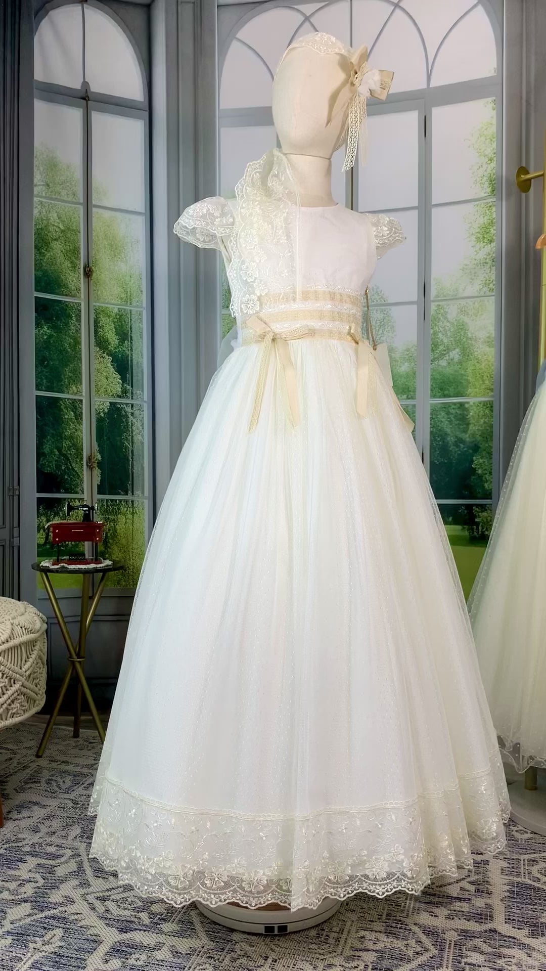 This delicate dress in a soft ivory tone is perfect for special ceremonies or a first communion. The design features intricate lace details on the bodice and cape-style sleeves, complemented by a layered tulle skirt that adds volume and elegance. A lace and satin ribbon belt accentuates the waist, enhancing the silhouette and adding a touch of sophistication.