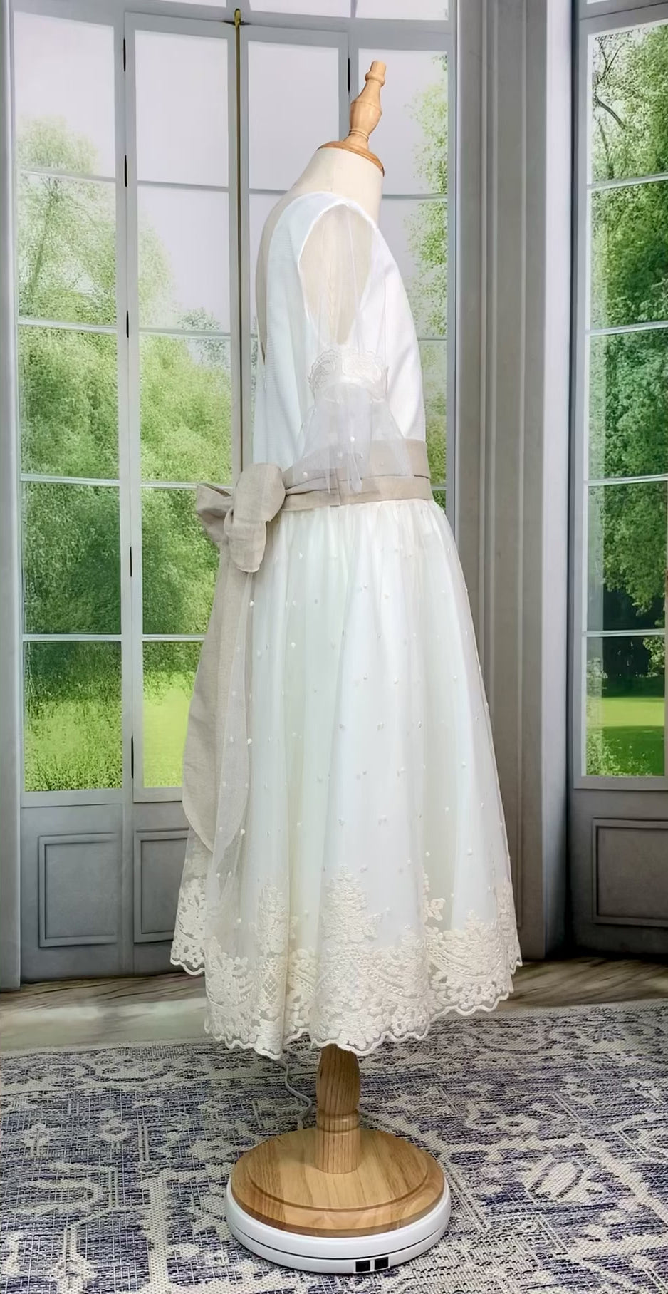 This dress is perfect for a special occasion, crafted in a soft ivory tone. It features semi-transparent sleeves with lace details and small embroidered dots. The lower part of the skirt has floral embroidery, adding an elegant and detailed touch to the design. The beige fabric belt with a side bow provides a beautiful contrast and a sophisticated finish. The back features a V-neckline and a zipper that makes it easy to put on, along with a large bow at the waist, creating a charming look from all angles.