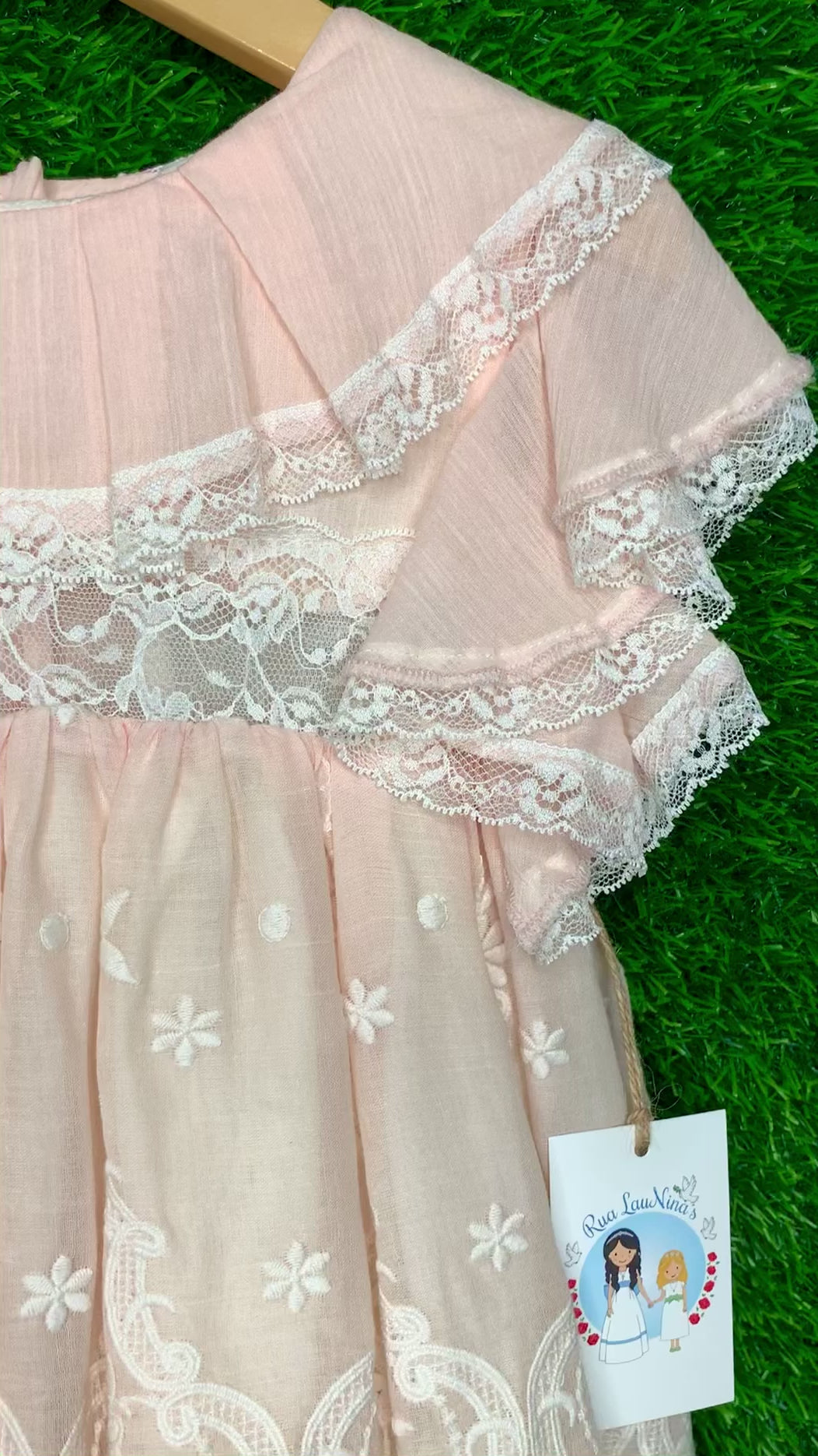 This charming dress in a soft peach pink tone is perfect for little ones on any special occasion. Designed with delicate embroidered lace details, it offers a classic and romantic style that will make your girl look adorable and elegant. The ruffled sleeves add a feminine touch, while the lace bow at the waist ensures a comfortable and stylish fit. The buttons at the back make it easy to wear, ensuring your girl feels as comfortable as she looks beautiful. Ideal for unforgettable moments.