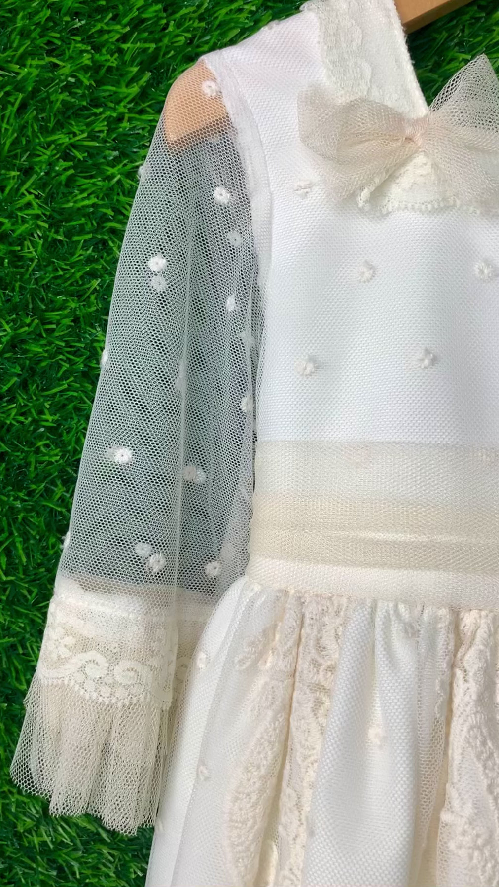 This elegant dress is the perfect choice for any special ceremony. Crafted in a delicate ivory tone, it stands out for its sophisticated design that combines embroidered tulle and lace, creating a timeless and refined piece.