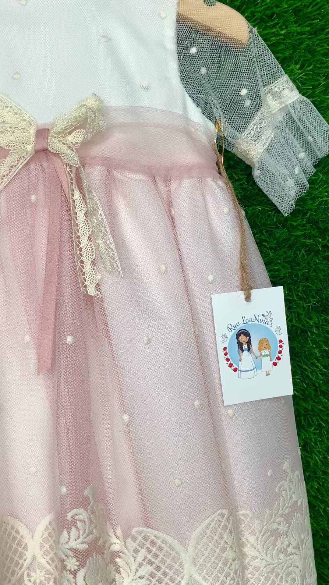 This dress is simply adorable and elegant, perfect for a baptism. Crafted in a soft pink tone, it features delicate embroidery and lace on the lower part of the skirt and sleeves, giving it a refined touch. The bow at the waist adds a charming detail, while the buttons at the back provide a comfortable and secure fit. Additionally, it includes a matching bonnet, completing this perfect set for such a special occasion as a baptism.