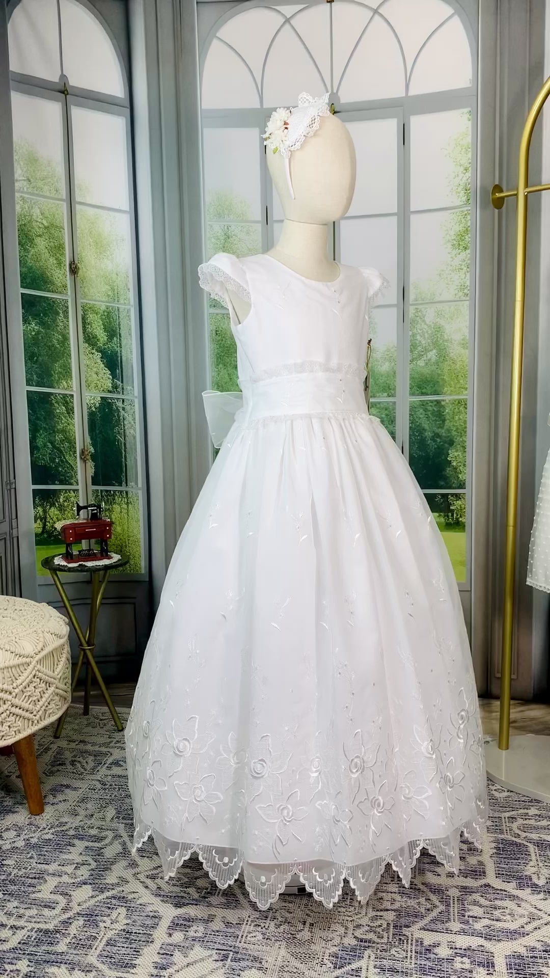 The Fatima Encantadora First Communion Dress is a traditional and timeless design, featuring exquisite embroidery for a stunning look. Crafted with care in white, this dress is fully lined with soft cotton for ultimate comfort. A sewn-in tulle petticoat at the waist adds graceful fullness to the skirt, while maintaining comfort. The ensemble also includes a coordinating headpiece, perfect for any special event and ensuring a radiant appearance for the child.