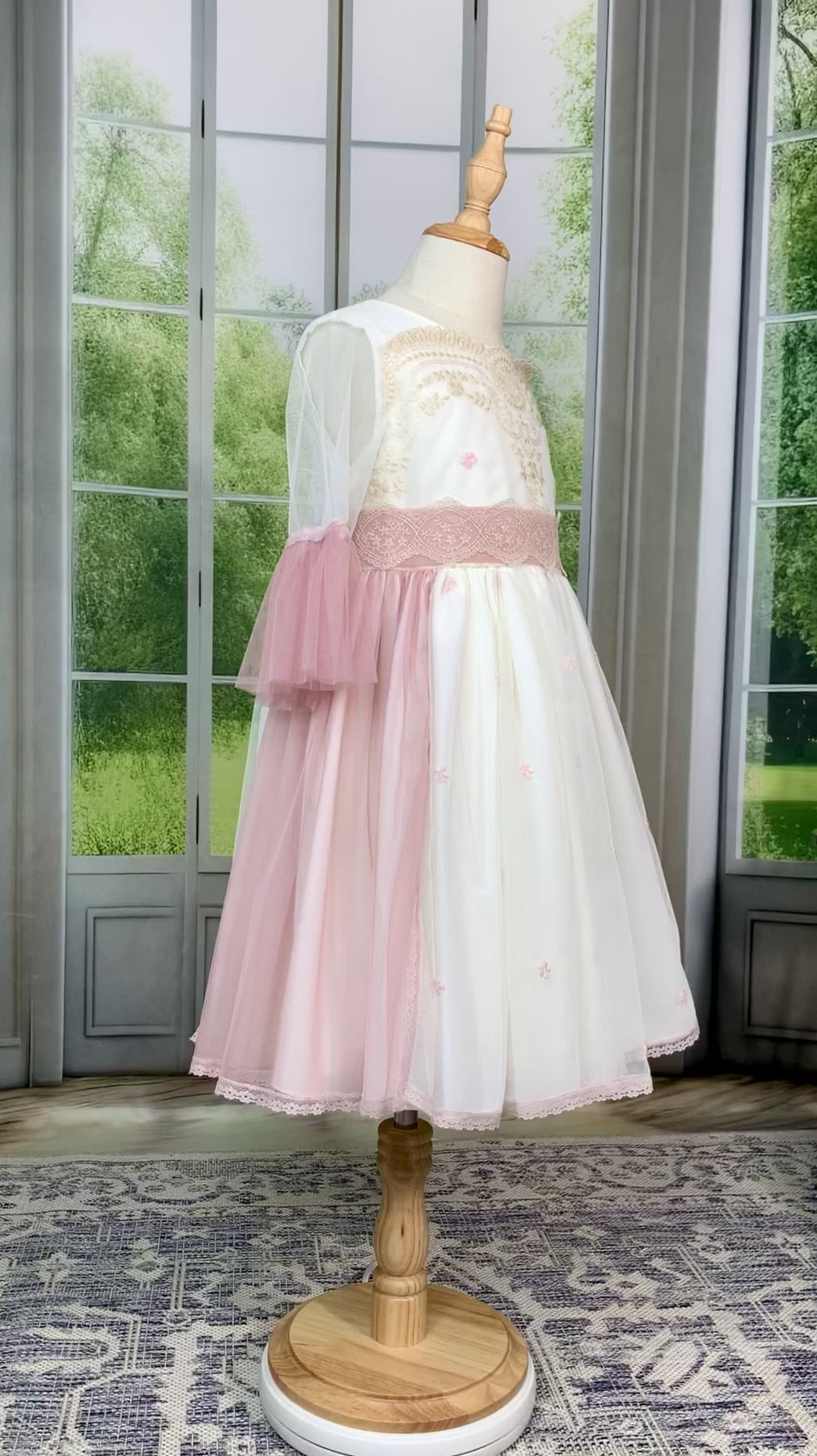 This delicate and charming dress perfectly combines a classic design with modern details. The bodice is adorned with intricate gold embroidery that stands out against a soft ivory tone, while the sleeves and the bow at the back are crafted in a beautiful shade of old rose, adding elegance and distinction. The white tulle skirt features small pink embroidered flowers, adding a romantic and subtle touch. The long tulle sleeves with ruffles and the lace band defining the waist enhance the silhouette of the dress, complementing the overall design. Ideal for special occasions, this dress ensures the girl looks sophisticated and charming at any important event.