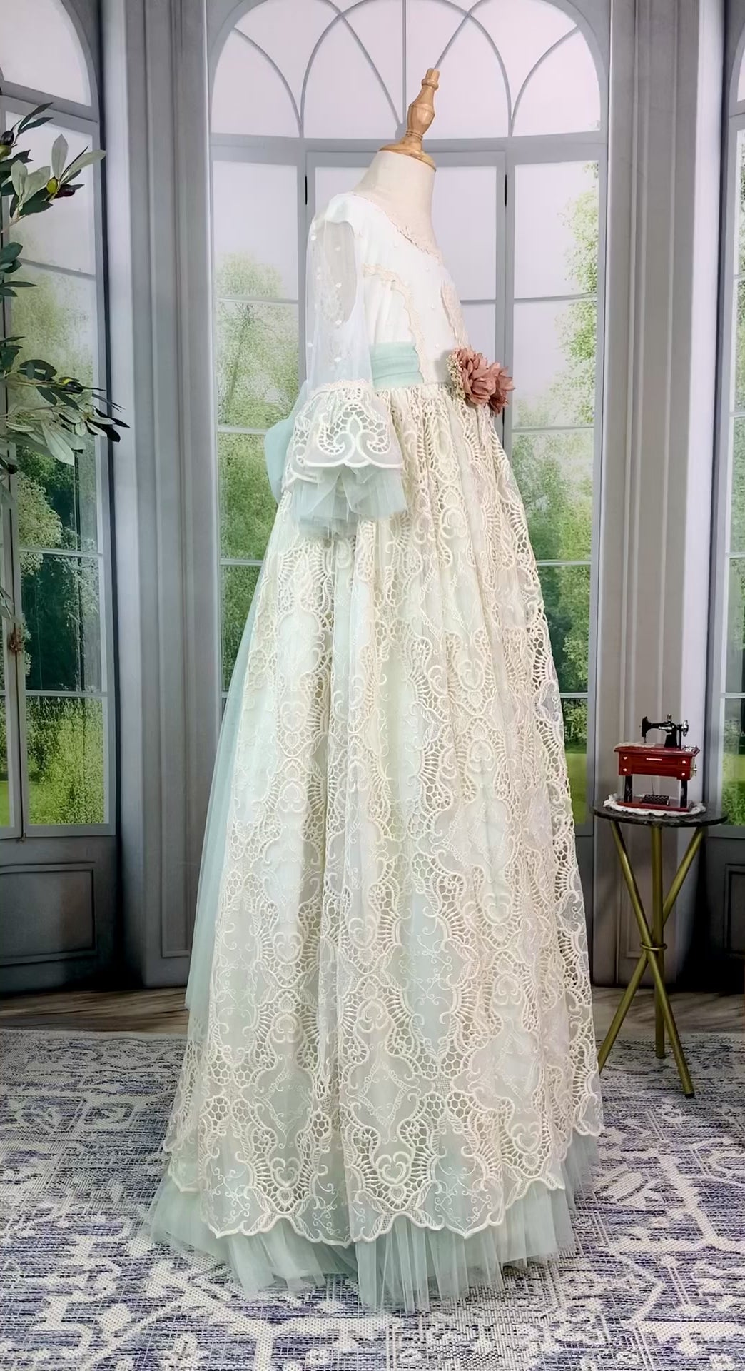 This dress stands out for its fine craftsmanship and vintage style. Made in aqua green and beige tones, it features floral lace, heart-shaped embroidery on the bodice, and tulle sleeves with embroidered details. The waist is adorned with dusty pink flowers, which can be removed, adding a romantic touch. Ideal for communions, weddings, and special events, it is an exclusive piece that combines comfort and elegance.