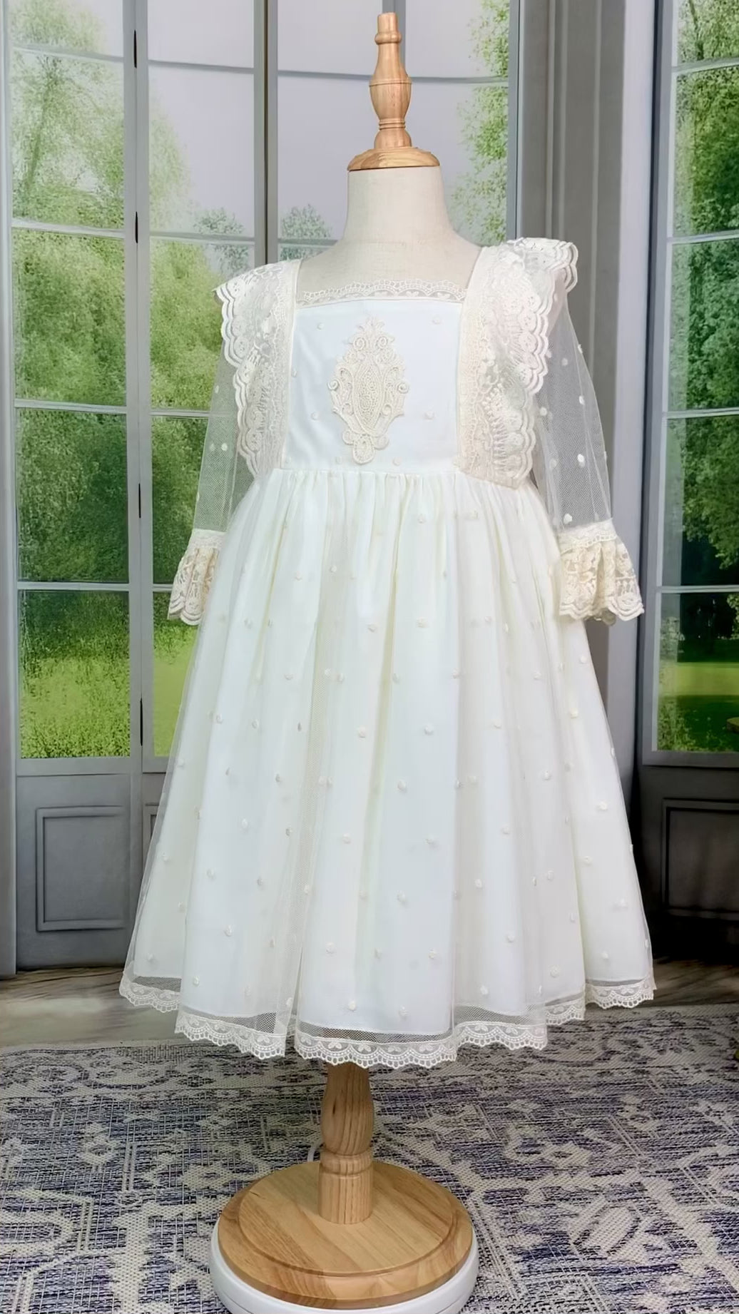 This exquisite ivory ceremony dress stands out for its meticulously crafted design, offering a combination of elegance and sophistication, making it an ideal choice for formal events. The upper part of the dress features intricate cream-tone floral embroidery that delicately frames the chest area, adding a touch of classic refinement. The tulle sleeves, adorned with lace appliqués and small embroidered dots, give the design a sense of lightness and romance, perfect for standing out at special occasions.