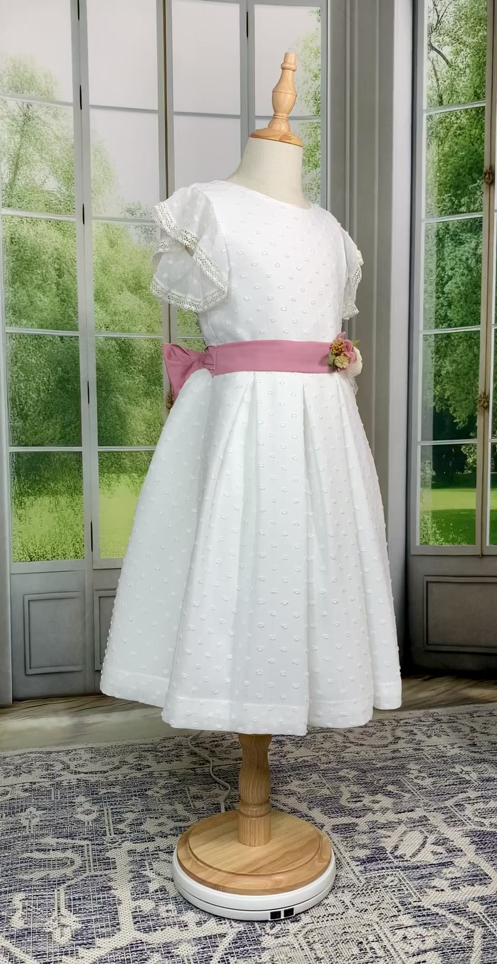 This charming white dress features a delicate and elegant design, perfect for special ceremonies. It is crafted from a fabric with small embroidered dots that add texture and a touch of sweetness. The bodice is simple and classic, with flutter sleeves made of embroidered tulle, which bring lightness and movement to the piece.