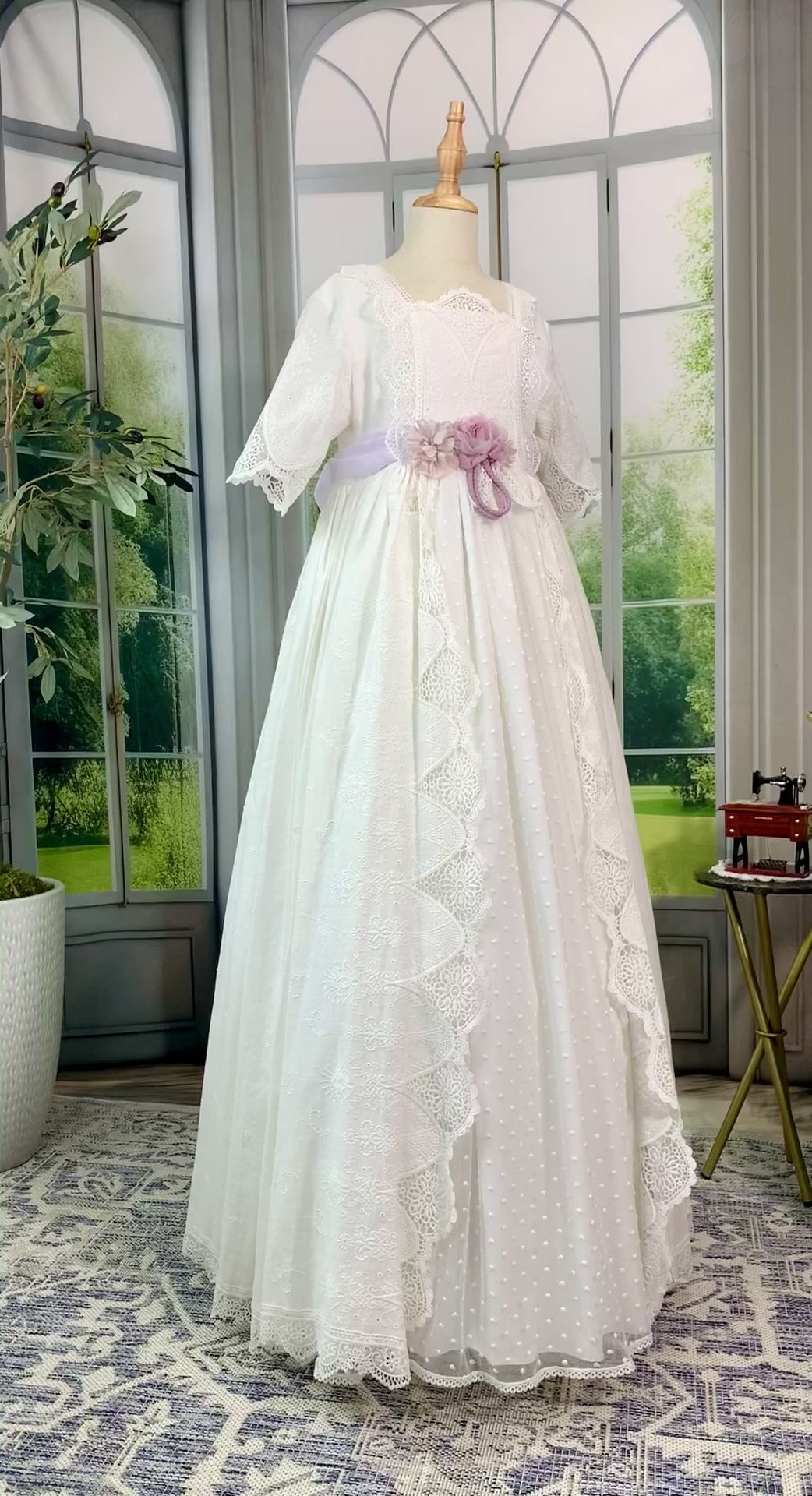 This dress, crafted from delicate white lace, is a sublime choice for special occasions such as First Communion or memorable celebrations. Its design blends a classic style with modern details, highlighting a romantic and timeless aesthetic. The three-quarter sleeves, finely adorned with lace, bring a discreet elegance while maintaining the innocence and sweetness of the outfit. The bodice features fine lace details on the front, complemented by a delicate ribbon at the waist in a pale lilac tone. This detail culminates in a bow with small flowers, adding a subtle touch of color. The long, flowing skirt is embellished with a barely noticeable dotted texture, which gives it movement and an ethereal appearance. At the back, a large tulle bow in the same lilac tone softly cascades, adding an extra touch of sophistication. The impeccable drape and the harmony of the details make this design a piece that balances tradition and modernity, ideal for those seeking a dress that combines elegance, delicacy, and a flawless finish.