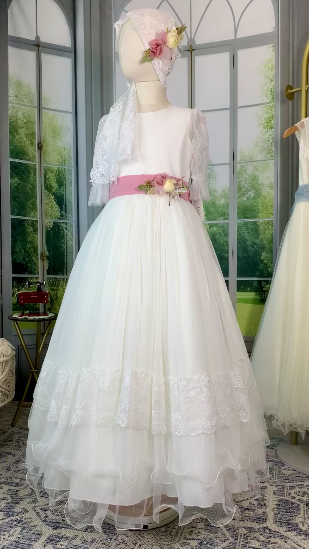 This sophisticated ceremony dress in off-white stands out for its timeless and elegant design. Made with multiple layers of high-quality fabric, it offers a delicate and fluid volume. The skirt is adorned with subtle lace details along the edge, adding a refined and artisanal touch, while the smooth bodice balances the ensemble with a simple yet sophisticated style. The waist is accentuated by a pale pink satin ribbon, adorned with a delicate floral appliqué in cream and pink tones, bringing a romantic touch. The transparent lace sleeves, finished with light ruffles, add elegance and movement to the design. The look is completed with a lace headpiece that delicately covers the head, adorned with a floral appliqué on the side, perfectly harmonizing with the waist details. The lace, crafted with artisanal precision, frames the face with a traditional and sophisticated air. Ideal for any special event where you want to stand out, this dress combines tradition, style, and carefully selected details for a memorable occasion.
