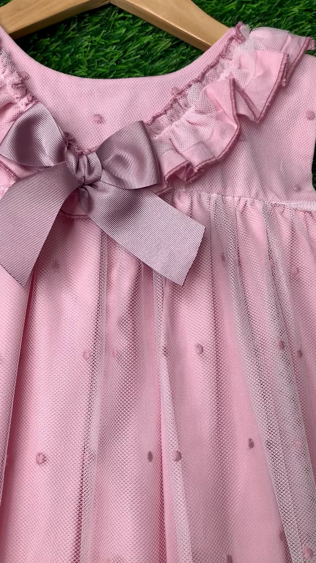 Vintage Old Rose Dress for girls, crafted from ethereal tulle adorned with delicate embroidery and elegant floral lace at the hem. This enchanting piece features a satin bow at the front and romantic ruffles along the neckline, enhancing its nostalgic and sophisticated appeal. Designed with a convenient button closure at the back, this dress seamlessly blends comfort with classic elegance, making it perfect for formal occasions or special celebrations. A timeless look that embodies refined charm.