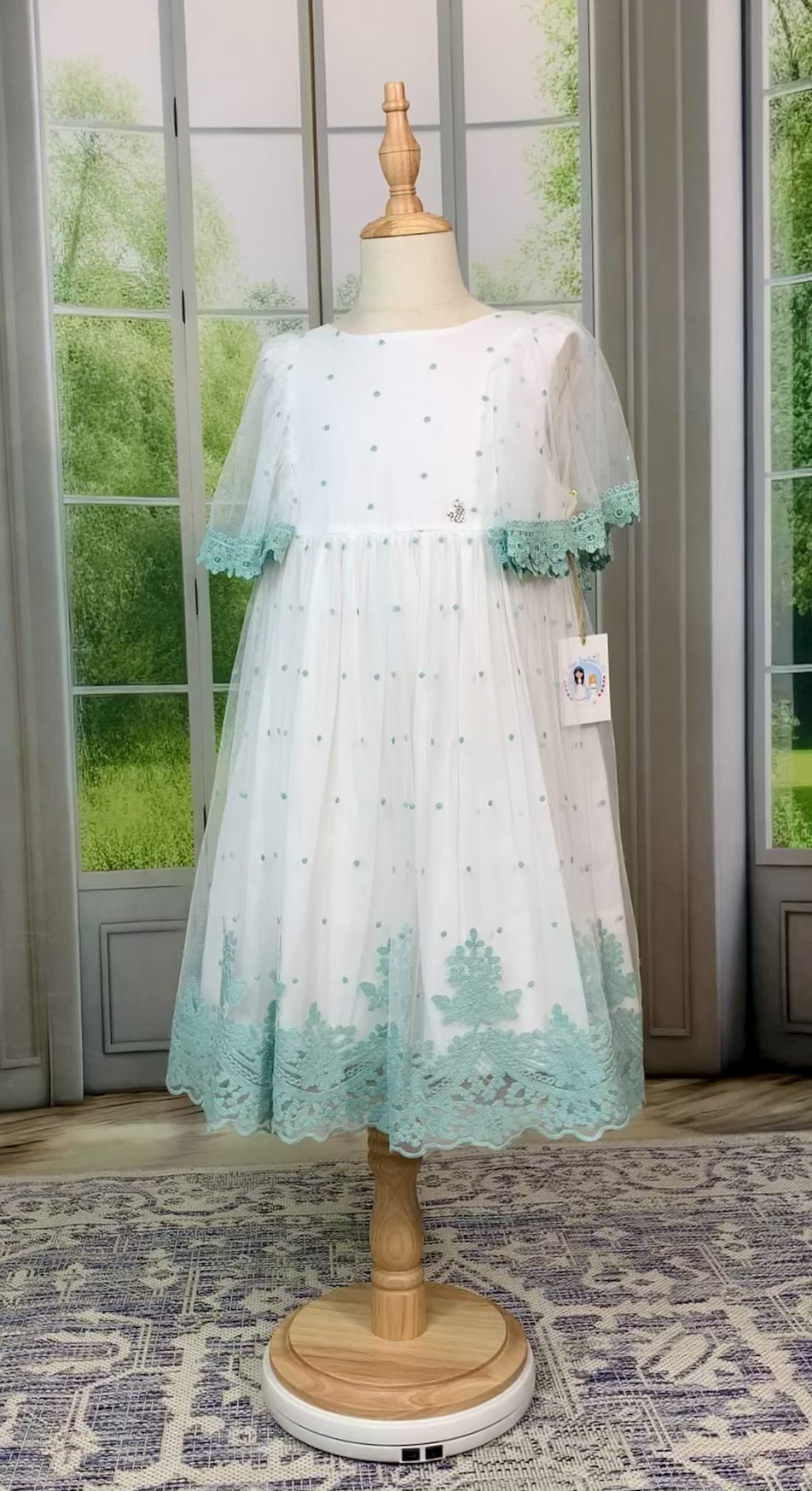 This charming dress features a light and elegant design, perfect for spring or summer events. Crafted in a delicate white tone with aqua green details, it is adorned with small embroidered polka dots throughout the garment. The sleeves are made of transparent tulle, with lace trim in the same aqua green tone that decorates both the sleeves and the bottom hem of the dress, adding a fresh and romantic touch.
