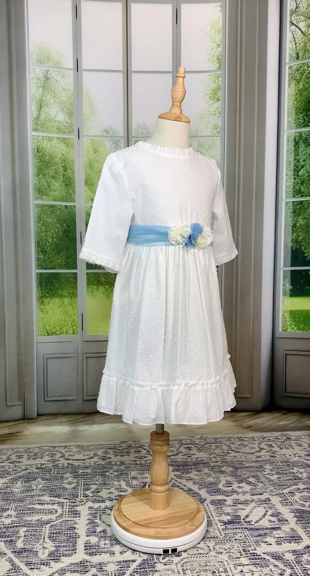 Get ready for any special occasion with the Ave Branca Ceremony Dress! Made from comfortable cotton, this white dress is designed for girls and features a beautiful light blue tulle adorned with artificial flowers and finished with a lovely bow at the waist. Perfect for your little princess, this dress is comfortable.
