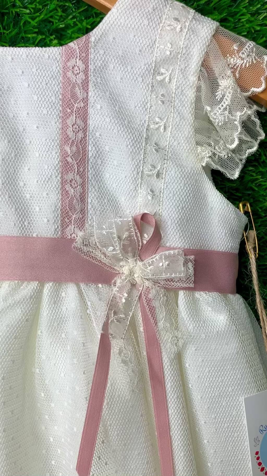 A key element of the design is the pale pink ribbon belt, which provides a harmonious contrast and ties into a bow at the waist, subtly defining the silhouette. The skirt ends with an exquisitely crafted lace hem, enhancing the classic and sophisticated aesthetic of the garment. At the back, the button closure, accompanied by the same pink bow, completes the design with a traditional and elegant touch.