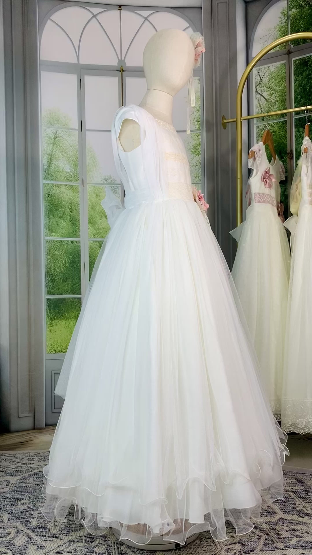 Este vestido de comunhão off-white combina um estilo delicado com detalhes únicos que o fazem se destacar. A saia ampla e fluida, feita de camadas de tule macio, cria um movimento elegante e leve. O corpete é decorado com sutis linhas de renda, adicionando um toque de tradição e refinamento. A cintura é adornada com um cinto floral em tons pastel que acrescenta um toque de cor e realça a silhueta. As mangas são desenhadas com leves pregas de chiffon que caem sobre os ombros, oferecendo um toque romântico e moderno. O look é completado com um adereço floral de cabeça que complementa perfeitamente o vestido, tornando este conjunto uma escolha ideal para uma comunhão ou qualquer evento especial onde se deseja um estilo elegante e sofisticado.