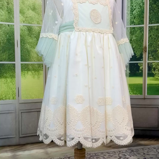 Este vestido exclusivo para meninas, feito na Espanha, é um exemplo impecável de elegância e detalhes artesanais, projetado para brilhar nas ocasiões mais especiais. Confeccionado em um delicado tom de marfim, o vestido é adornado com intrincados bordados florais e renda fina na barra, conferindo-lhe um ar de sofisticação e doçura.