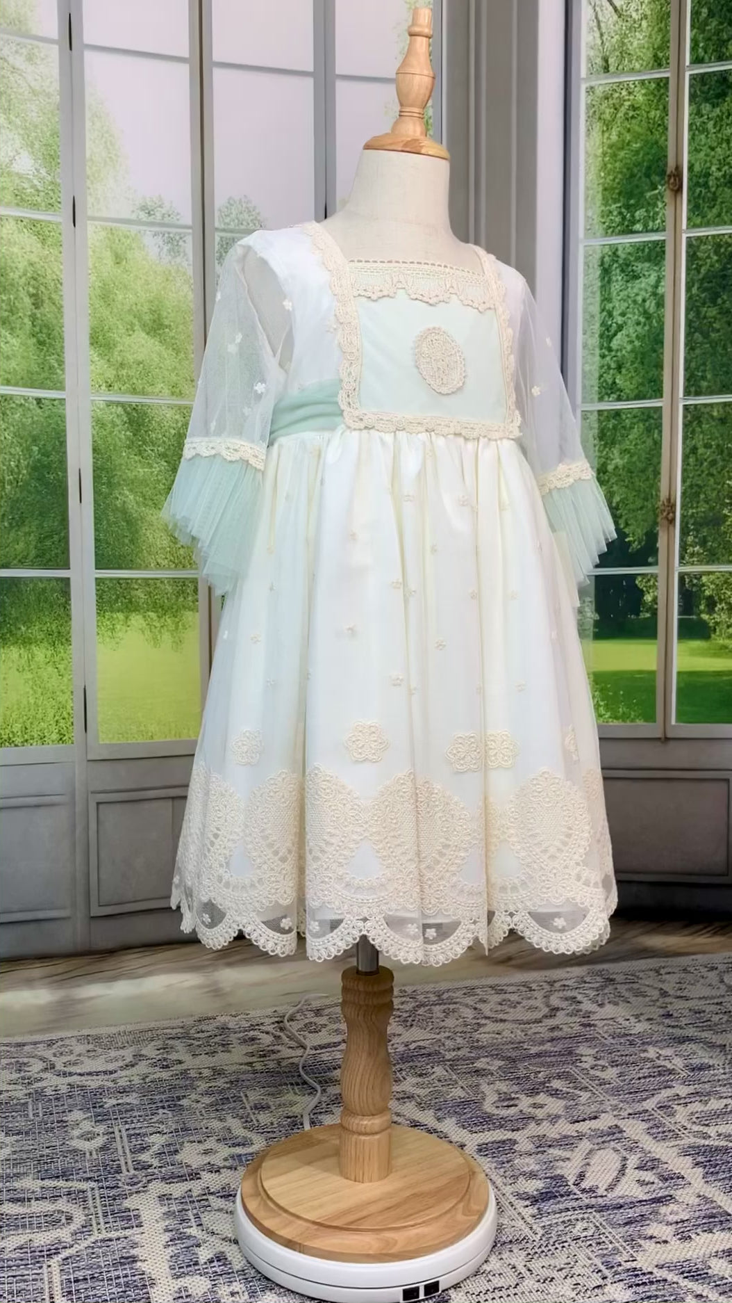 As mangas longas, feitas de tule leve, são decoradas com bordados sutis e finalizadas com renda, criando um efeito romântico e etéreo. O design frontal apresenta um delicado painel central emoldurado por renda, realçando o estilo clássico e tradicional do vestido. Nas costas, um laço verde menta adiciona um toque encantador e feminino, destacando a cintura e acrescentando volume ao design.
